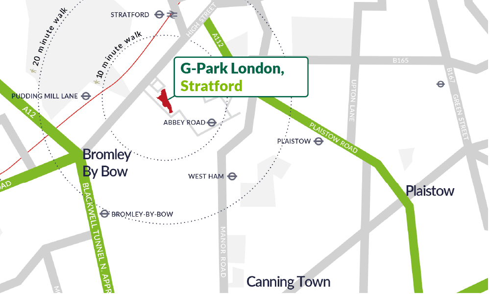 G-Park London – Stratford is located within East London’s primary commercial centre, at the heart of Stratford’s regeneration area. Located 9 miles from the M11 Junction 4, with quick access to the M25 and wider transport network.