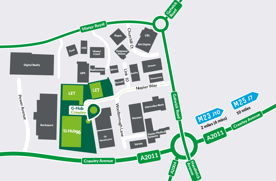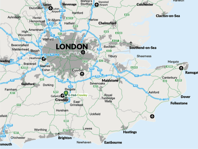 G-Hub Crawley is located on Manor Royal, one of the premier industrial and business districts in the South East. The site’s proximity to London and position in the South East makes it ideal for a range of logistics uses, including last mile logistics.