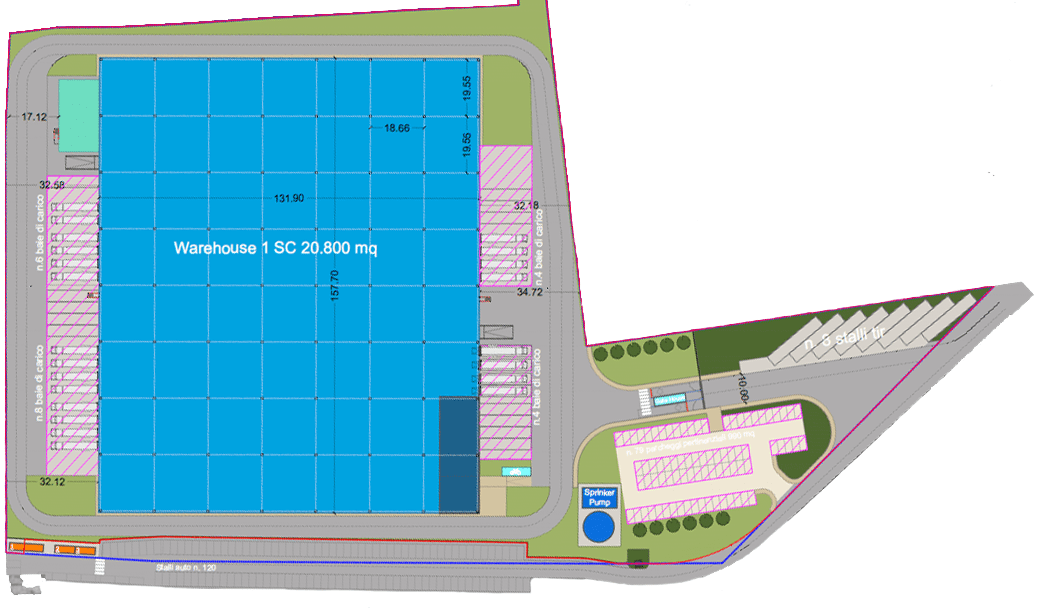 G-Park Anagni 2 is the new top-quality logistics hub designed to meet the challenges of the contemporary market. The location is spread over an area of 21,867 sqm, of which 20,583 for warehouse use with 22 loading bays, clear internal height of 12m and a floor capacity of 7,000 kg/sqm.