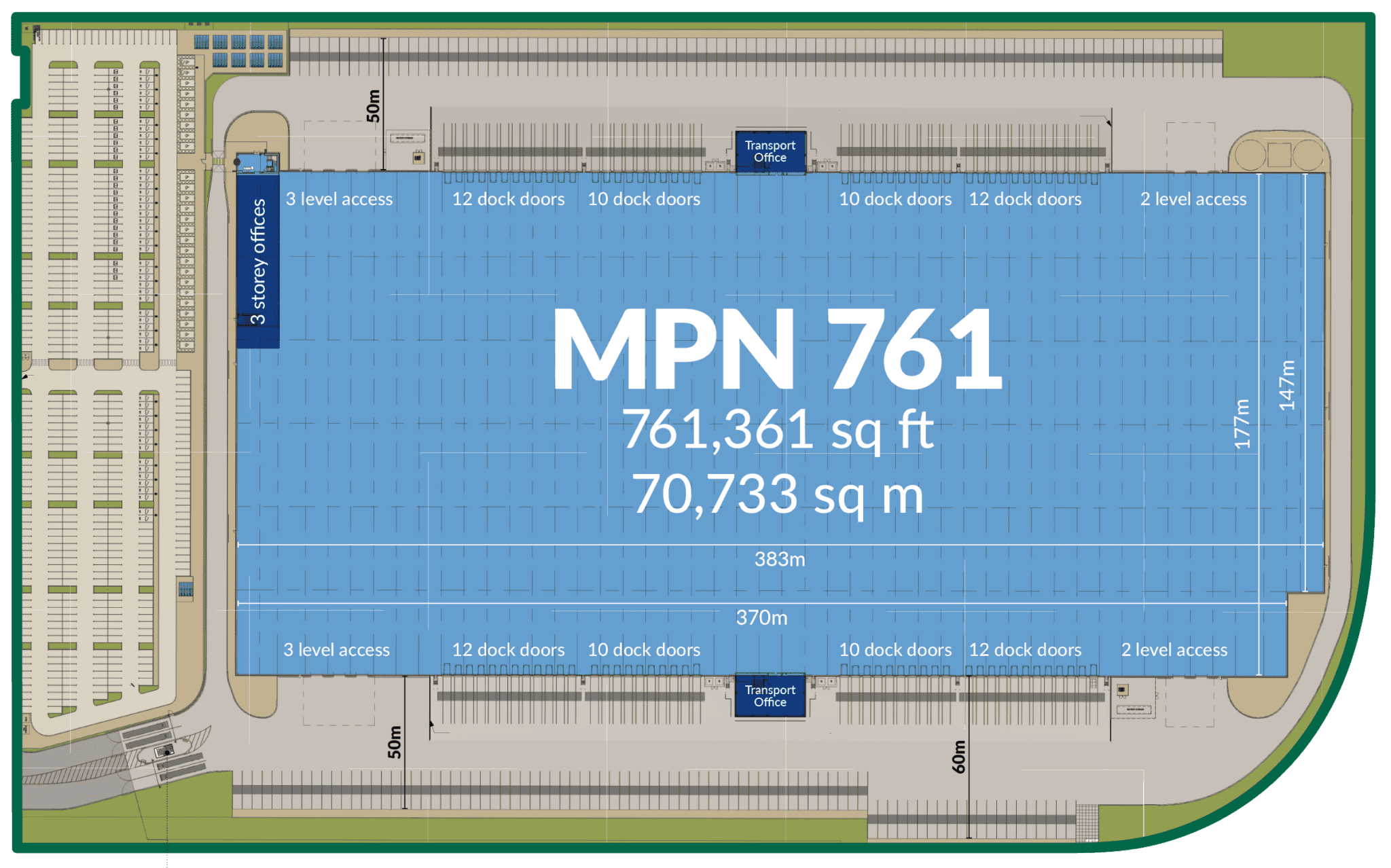 Designed for operational efficiency, MPN 761 boasts an 18m clear height, 80 dock doors, 10 level access doors, and two 50m secure service yards. The facility includes 525 car parking spaces, 94 HGV bays, 54 EV charging stations, and 180 cycle spaces. Its flexible layout supports up to 142,720 pallet positions.