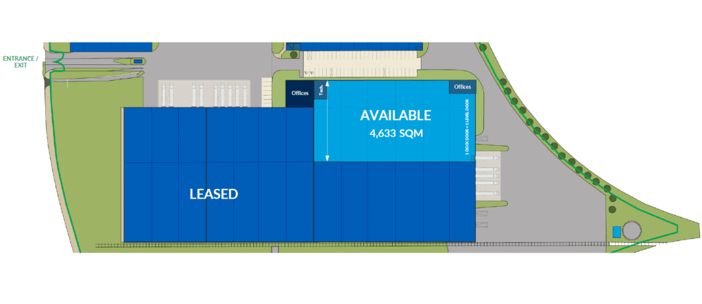 Le bâtiment dispose d’une porte à quai et d’un accès de plain-pied, sa hauteur libre est de 7.70m, 100 m² de bureaux sont également disponibles ainsi que 20 places de parking VL.