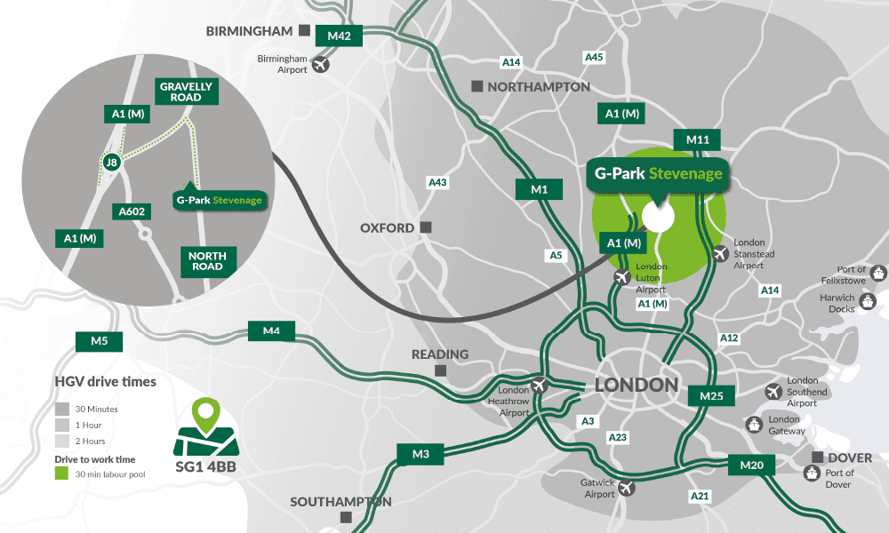 G-Park Stevenage is the ideal location for reaching the Midlands and Southern markets in the UK, with the Port of Tilbury and London Gateway accessible in less than 90 minutes, providing easy access into Europe.