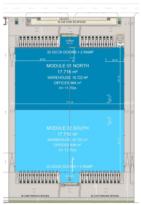 In the heart of the logistics hub of Sagunto, Valencia, on a 57,119 sqm plot, we present our logistics project: an avant-garde development with a built area of 35,568 sqm, divisible into two modules of 17,716 sqm each.