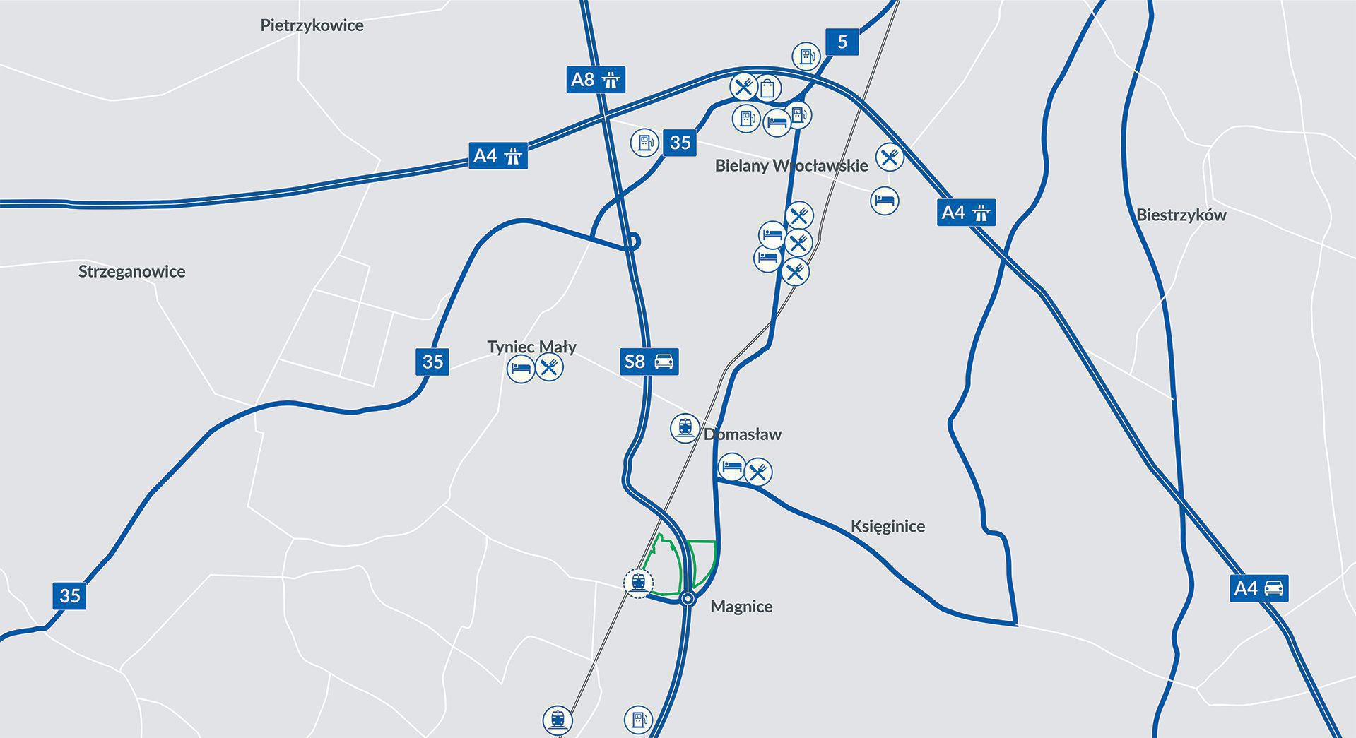 - Bezpośrednie sąsiedztwo węzła drogi DK8/S8 oraz szybki dostęp do dróg ekspresowych S3 i S5 oraz autostrad A4 i A8,