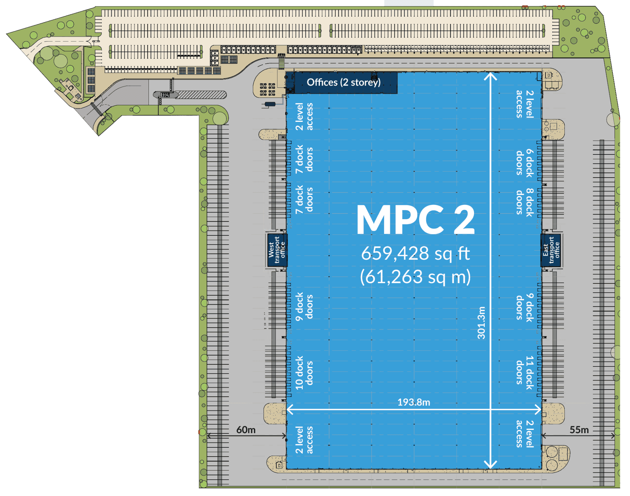 This built-to-suit warehouse includes 67 dock doors, 4 level access doors, 18m clear internal height, and generous 55m and 60m service yards. Two-storey offices and dedicated transport facilities support operational efficiency, while 571 car parking spaces and 29 EV charging bays enhance accessibility. MPC 2 is designed for occupiers seeking scalable logistics warehouse space in a thriving commercial land development hub.