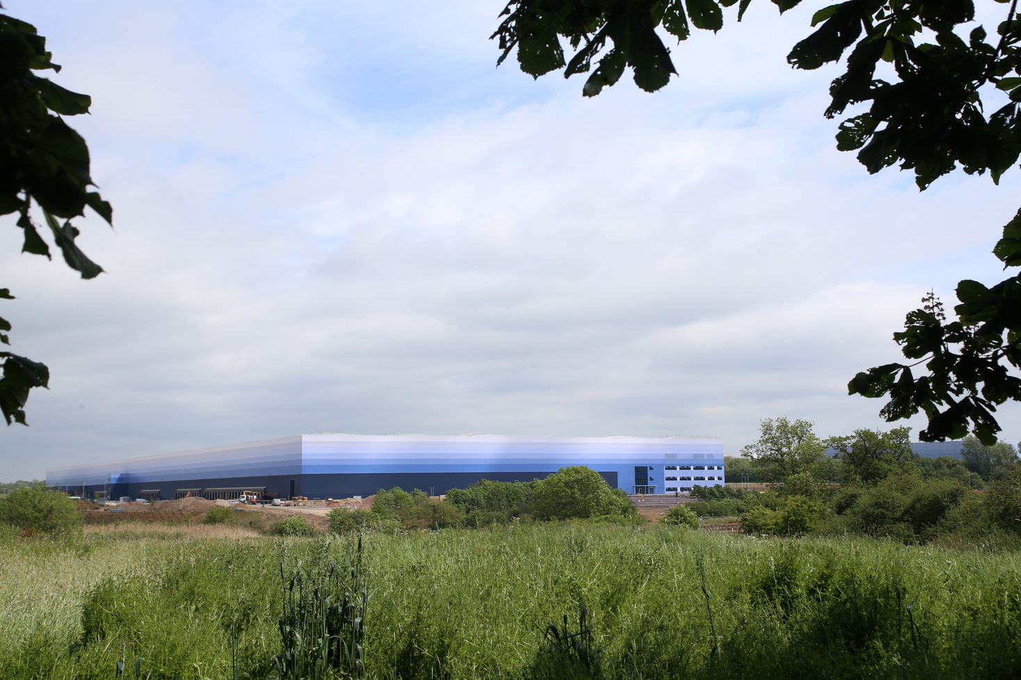 GLP Logistics Centre under a cloudy sky, with a blue colour scheme and branded letters that read wayfair installed onto the outside wall.